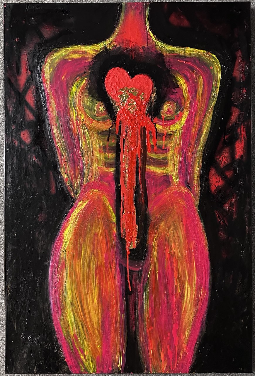 Behind every heart lies a shadow of pain—wounds from past grievances, unspoken words, shattered relationships, and other searing experiences. Each of us arrives on Earth with a heart of gold, pure and radiant. Yet, what becomes of it in the crucible of society? This painting reflects on the fragility of our inner light and the scars that shape us, inviting viewers to explore the resilience beneath the brokenness.